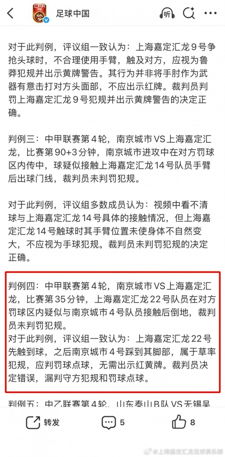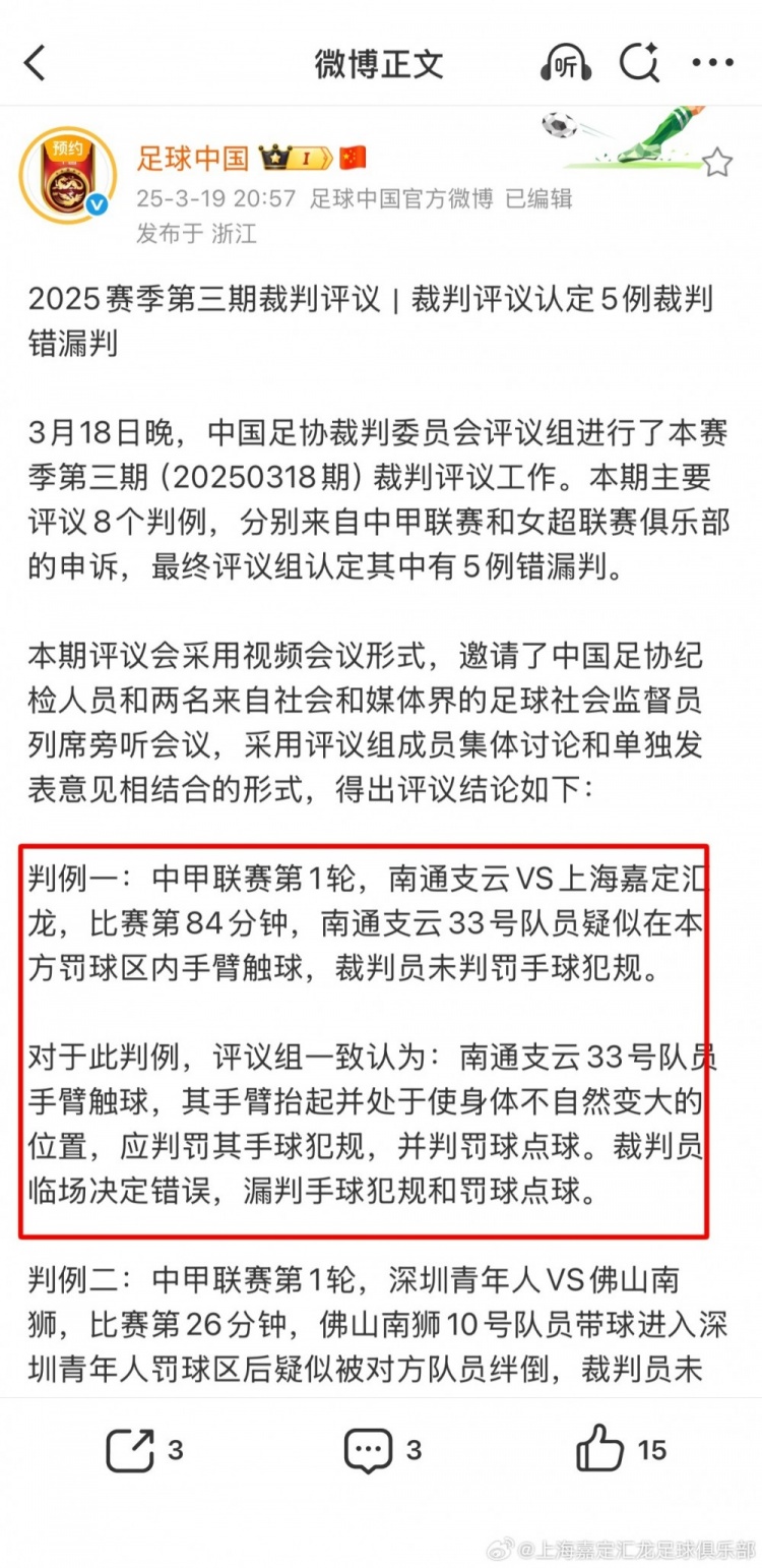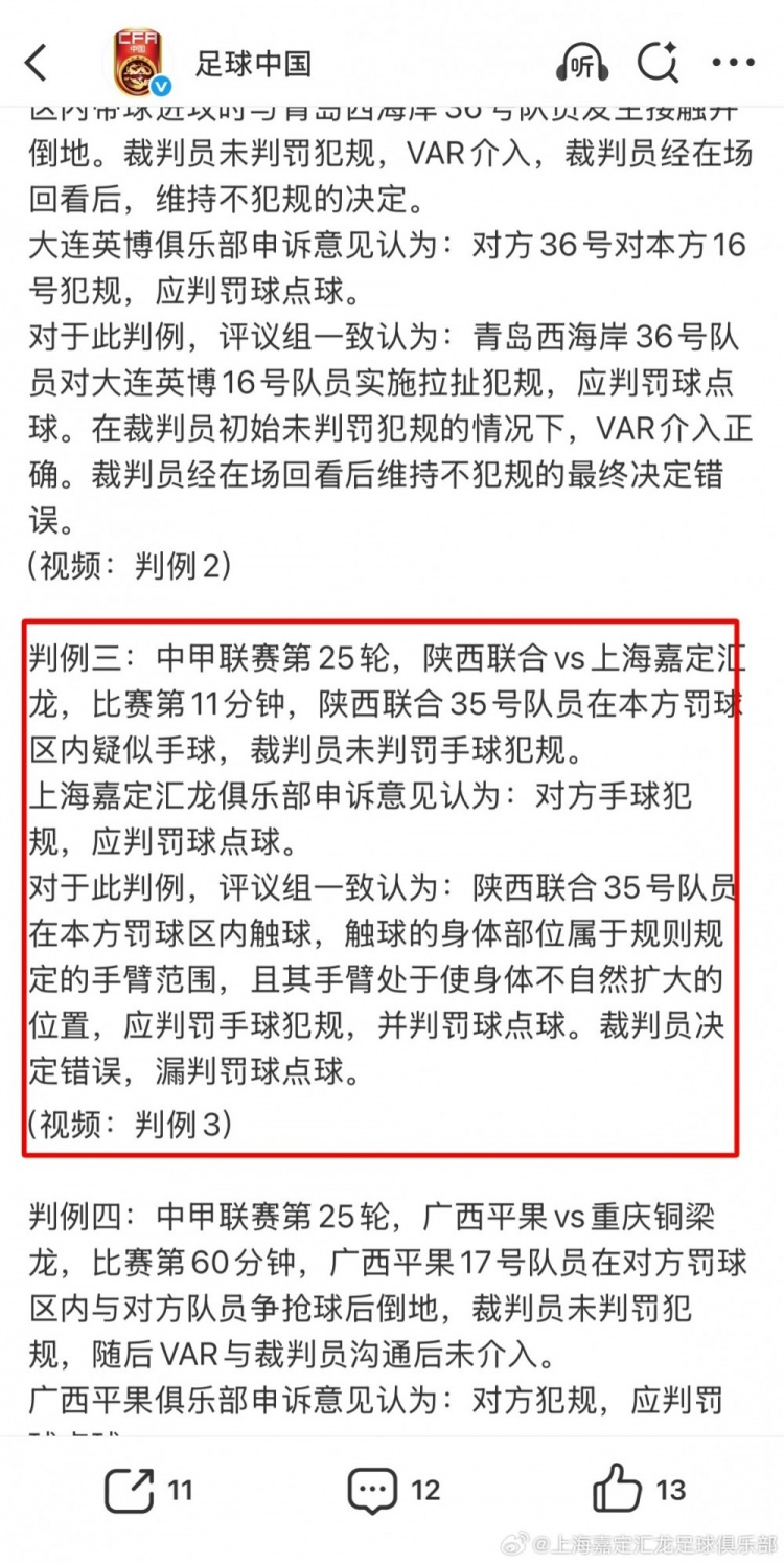 上海嘉定汇龙官方写谈:本赛季中甲联赛截止上轮,经中国足协裁委会评议组认定,共三次漏判给上海嘉定汇龙点球。