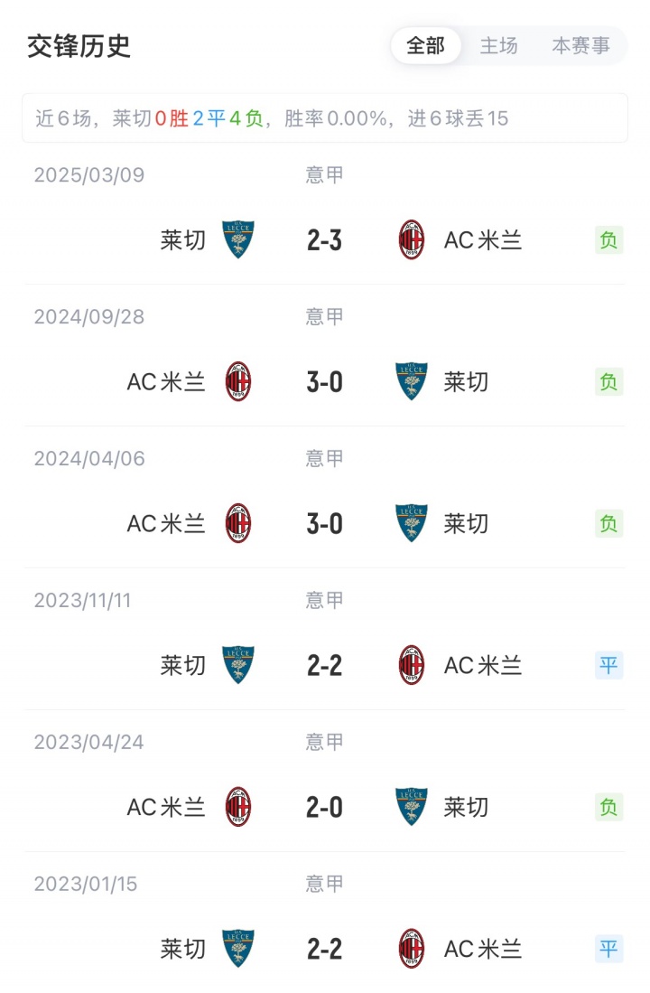 首轮米兰1-2不敌克雷莫纳,莱切0-0战平热那亚。米兰对莱切已14场不败,战绩为9胜5平。