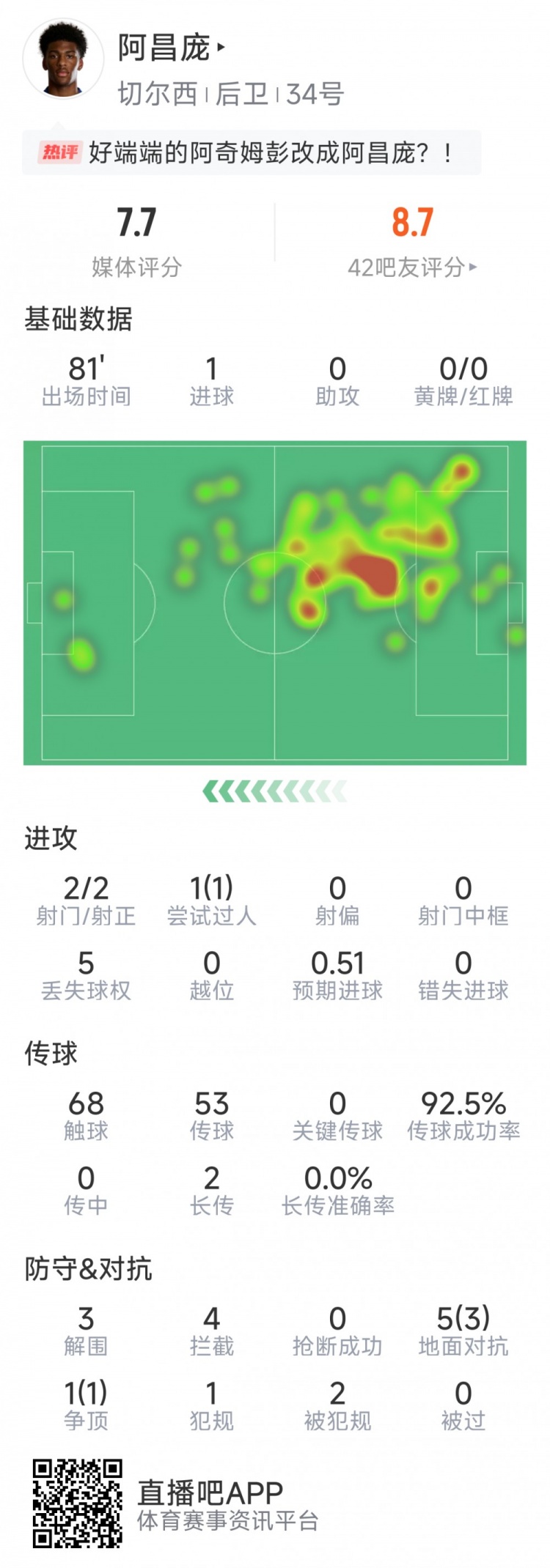 10月18日讯 在本轮英超切尔西对阵诺丁汉丛林的比赛中,阿昌庞打进蓝军生计处子球。以下为他在本场数据: