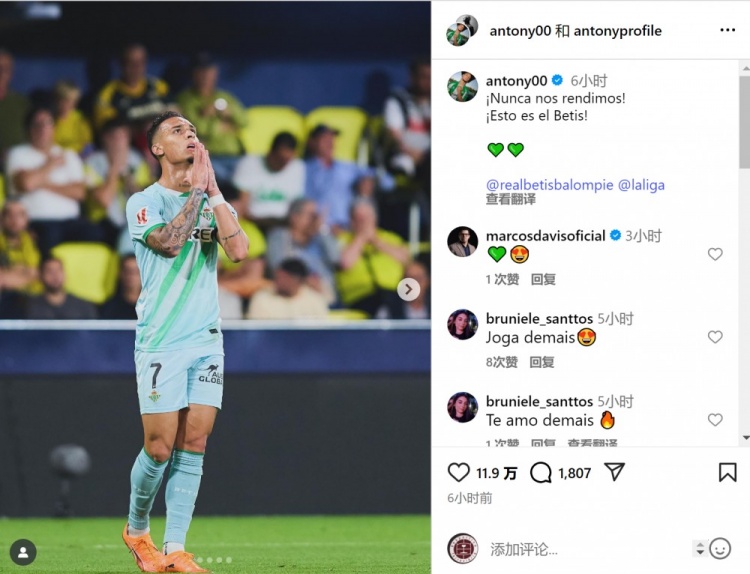 安东尼社媒晒出庆祝进球的相片,配文:“咱们永不言弃,这便是贝蒂斯!”