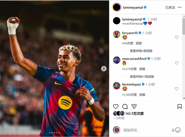 亚马尔赛后社媒晒照庆祝到手,配文:“坚硬。”