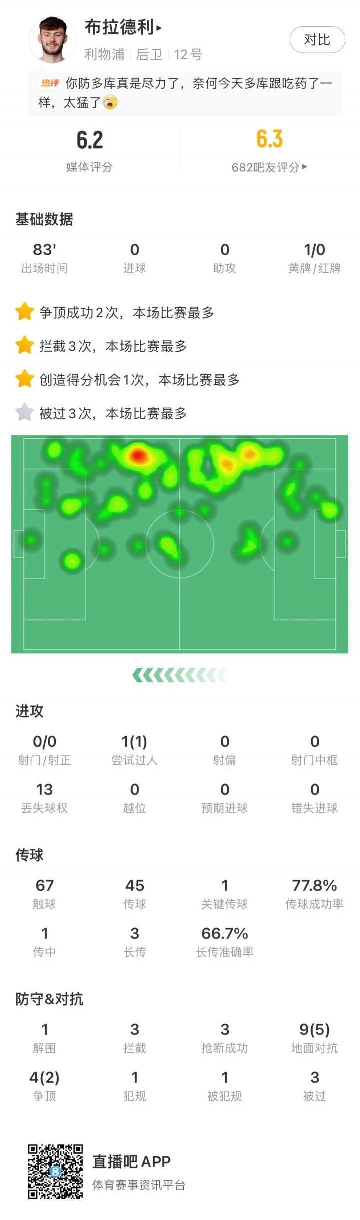 在周中进行的欧冠比赛中,布拉德利面临皇马发扬果敢,收效拆伙住了“世一左”维尼修斯。