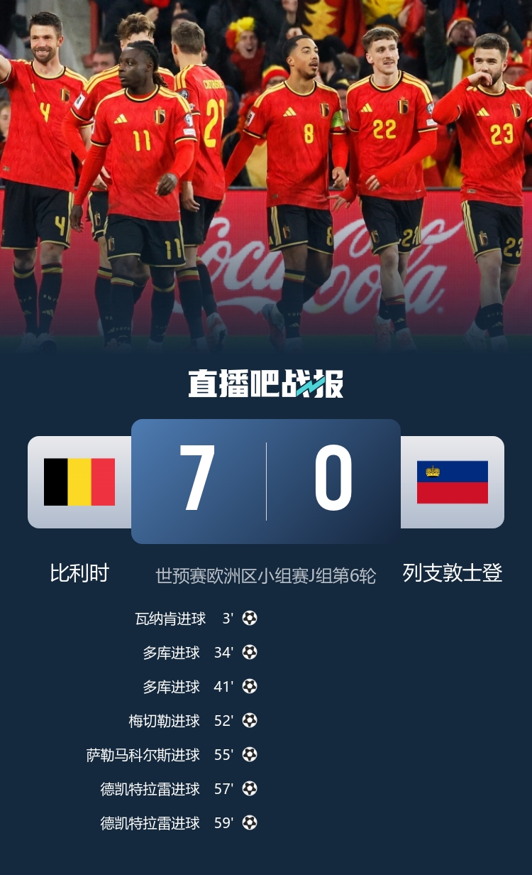 比利时7-0列支敦士登,欧洲红魔以摧枯拉腐之势大捷晋级寰球杯。