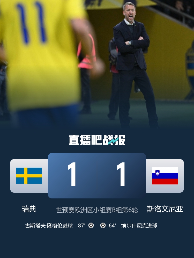 瑞典战平斯洛文尼亚,最终瑞典名次小组垫底,将凭借欧国联的保底阅历插足世欧预附加赛。