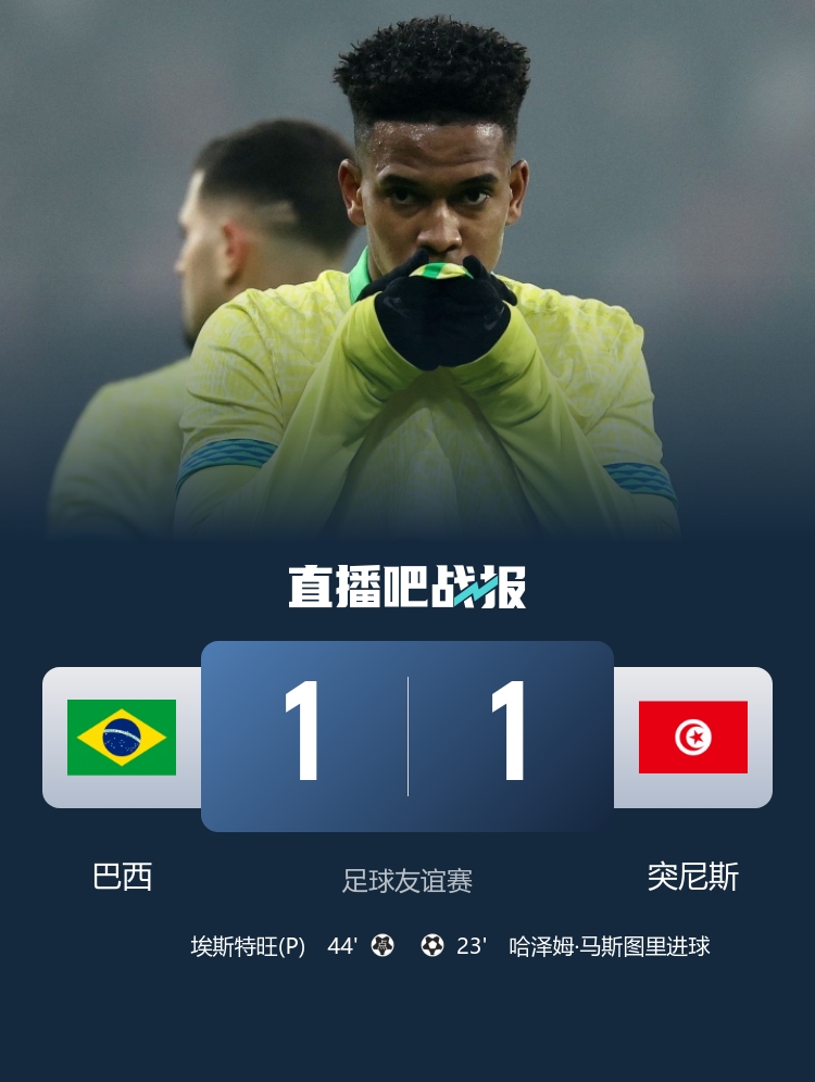 友谊赛对阵,巴西1-1战平突尼斯,埃斯特旺本场点射立功,值得温雅的是米利唐在这场友谊赛受伤了。