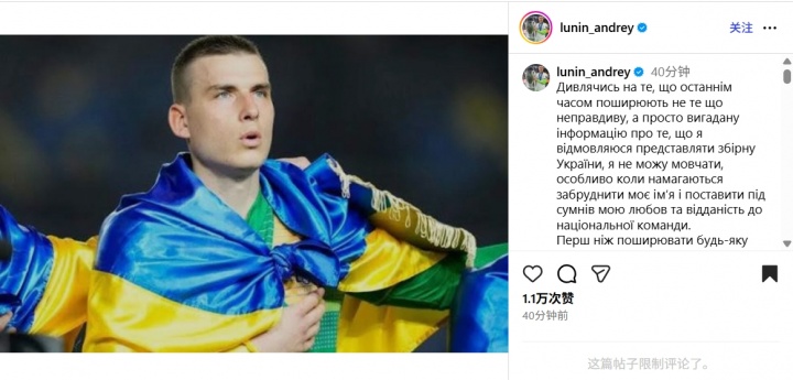 皇马门将卢宁发布社媒,关于联系我方闭幕为乌克兰出场比赛的报说念进行辟谣,并称我方弗成能闭幕为国度出战。