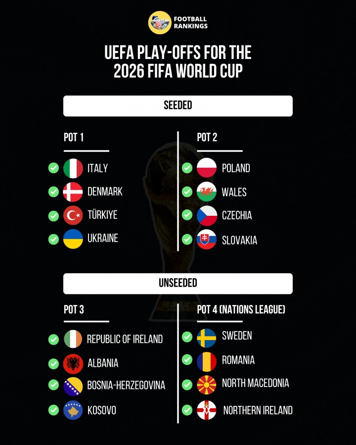 世欧预附加赛分档出炉,16支戎行将进行恣虐的角逐,争夺临了四个出线限额。