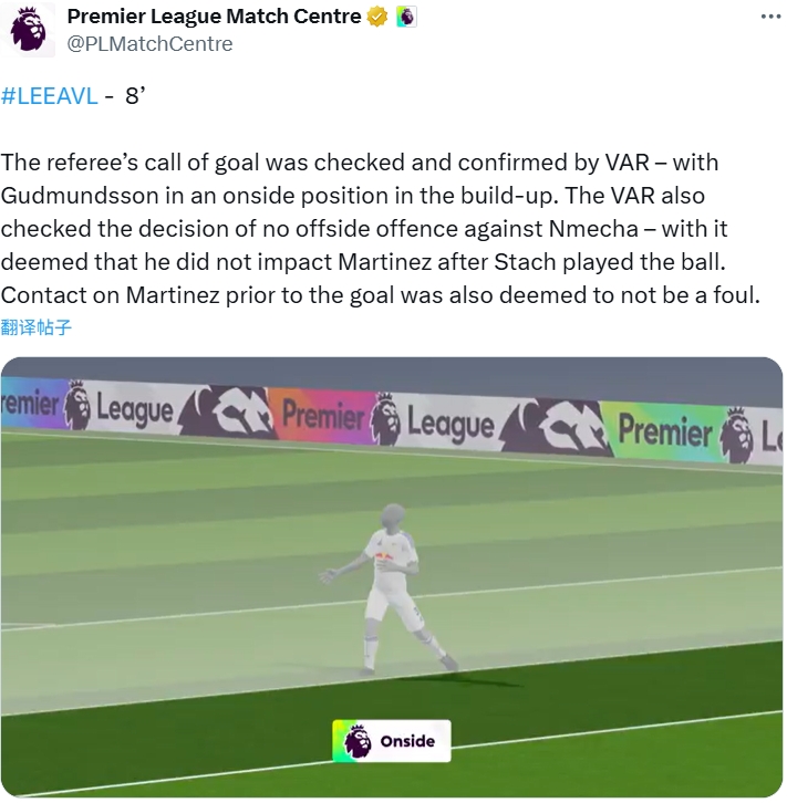 利兹联vs阿斯顿维拉第8分钟,主裁判判罚进球有用,VAR回放并证据:古德蒙德森处于不越位的位置,VAR同期复核了对恩梅查未判越位的决定,认定斯塔赫触球后,恩梅查并未影响马丁内斯。同期进球前对马丁内斯的战争亦被判定不组成犯规。