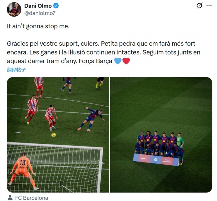 奥尔莫本东谈主在应答媒体发文,为我方饱读劲。奥尔莫上传了我方对阵马竞的进球俄顷,以及巴萨全队的合影,并配文写谈:“这扼制不了我。”