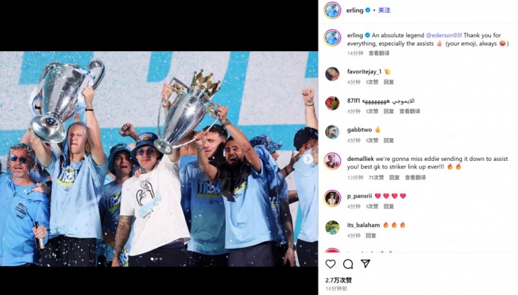 哈兰德晒出他与埃德森三冠王赛季共同庆祝的合照,并配文:“一位完全的听说东谈主物@埃德森!谢谢你的一切,尤其是你的助攻👍🏻(你的豪情标志,老是如斯😂)”
