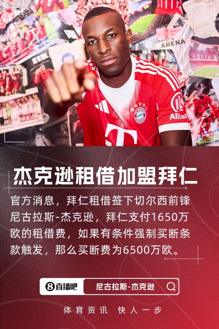 切尔西前卫杰克逊租赁加盟拜仁,据悉租赁费1650万欧元,有条款的强制买断用度6500万欧元。