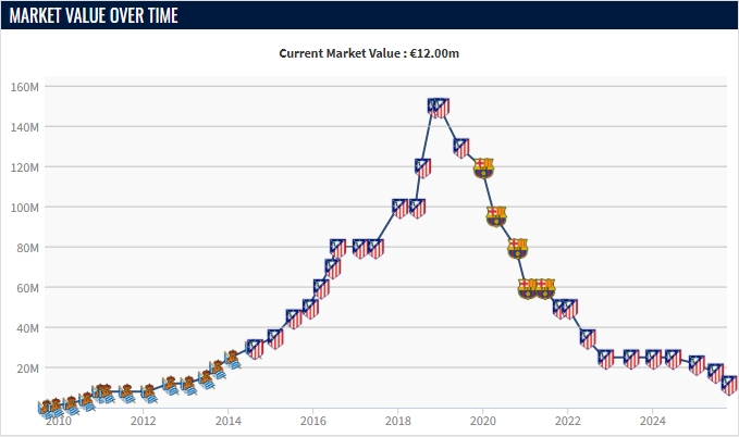 10月03日讯 德转昨日更新了西甲联赛的球员身价,34岁的格列兹曼身价不息下落,还剩1200万欧。