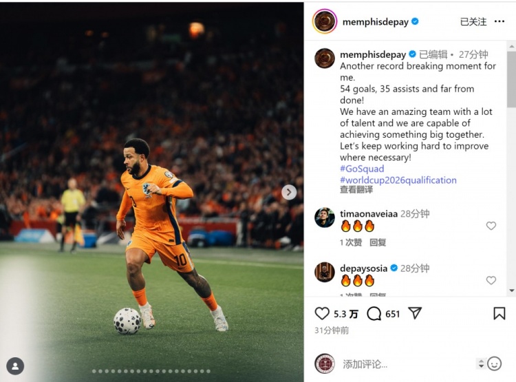 德佩社媒晒出比赛相片,并写谈:“对我来说又是一个突破记录的技能。 54个进球,35次助攻,况兼远未领域!”