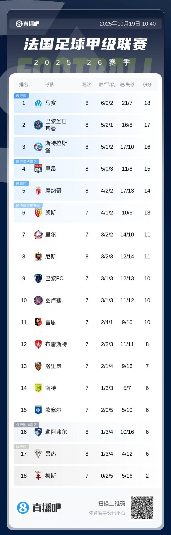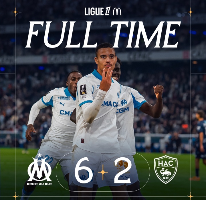 10月19日讯 法甲第8轮,马赛6-2大捷勒阿弗尔,豪取法甲5连胜,登顶积分榜。