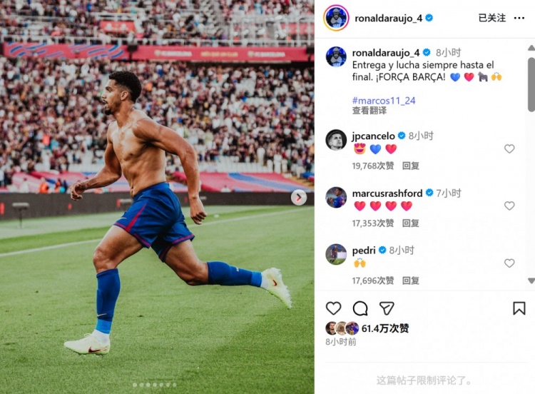 赛后阿劳霍也在社媒晒出进球后脱衣庆祝的相片,配文写说念:“遥远拼尽全力并坚抓到临了一刻,加油巴萨!”
