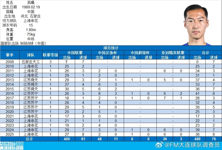 11月1日讯 据博主“FM大连球队拜访员”统计,吴曦仍是已毕了中国顶级联赛出场400场里程碑。