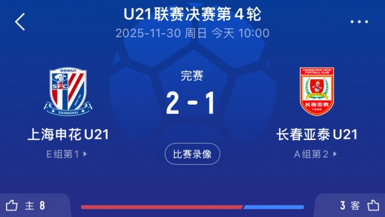 11月30日讯 中超U21联赛决赛阶段第4轮,上海申花2-1打败长春亚泰。