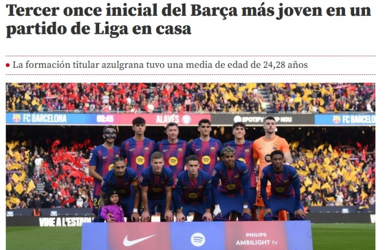 11月30日讯 《天下体育报》报说念,在巴萨3比1降服阿拉维斯的比赛中,巴萨主帅弗里克派出的首发气势平均年事为24.28岁。据统计,这是巴萨在诺坎普球场进行的西甲联赛中,队史第三年青的首发气势。