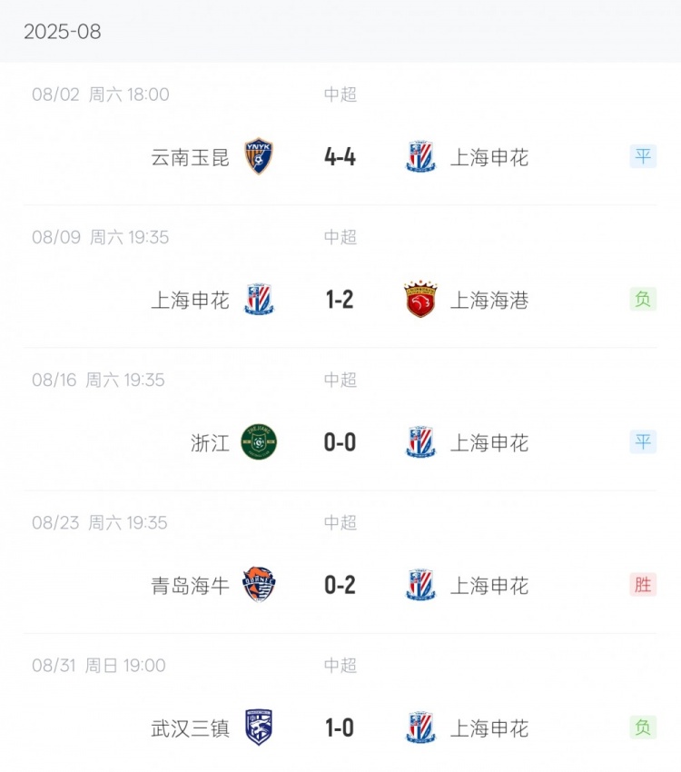 据统计,本年8月上海申花一共踢了5场比赛,战绩仅为1胜2平2负,拿到5个积分!