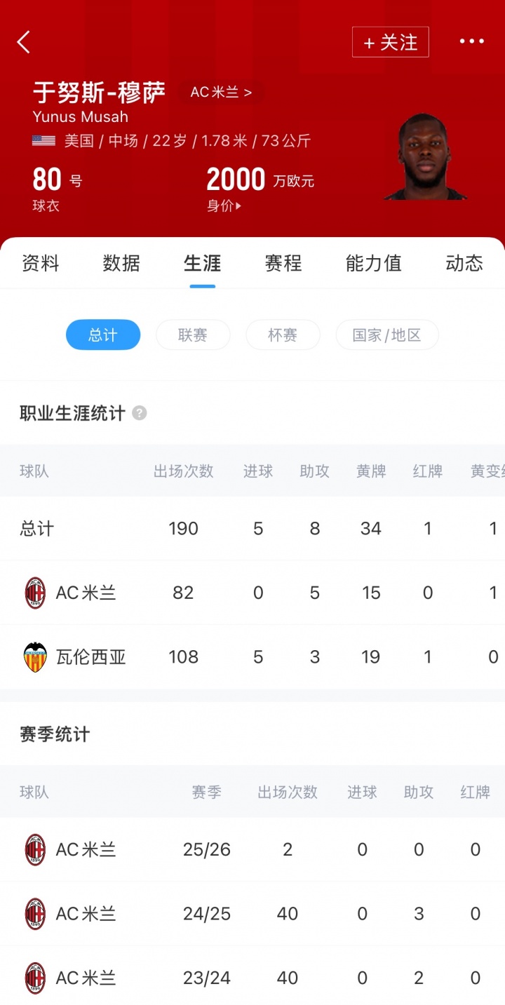 穆萨现年22岁,司职中场,加盟米兰后球员觉得出场82次,孝顺5助。现在穆萨德回身价为2000万欧元。