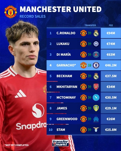 德转晒出曼联出球球员收入的排名榜,加纳乔以4620万欧元转会费成为曼联队史售价第四高的球员。罕见了2003年贝克汉姆加盟皇家马德里时的3750万欧元。C罗2009年以9400万欧元转会皇马也曾曼联队史最高售价记载,德转暗示,短期内极有可能无东谈主能罕见。