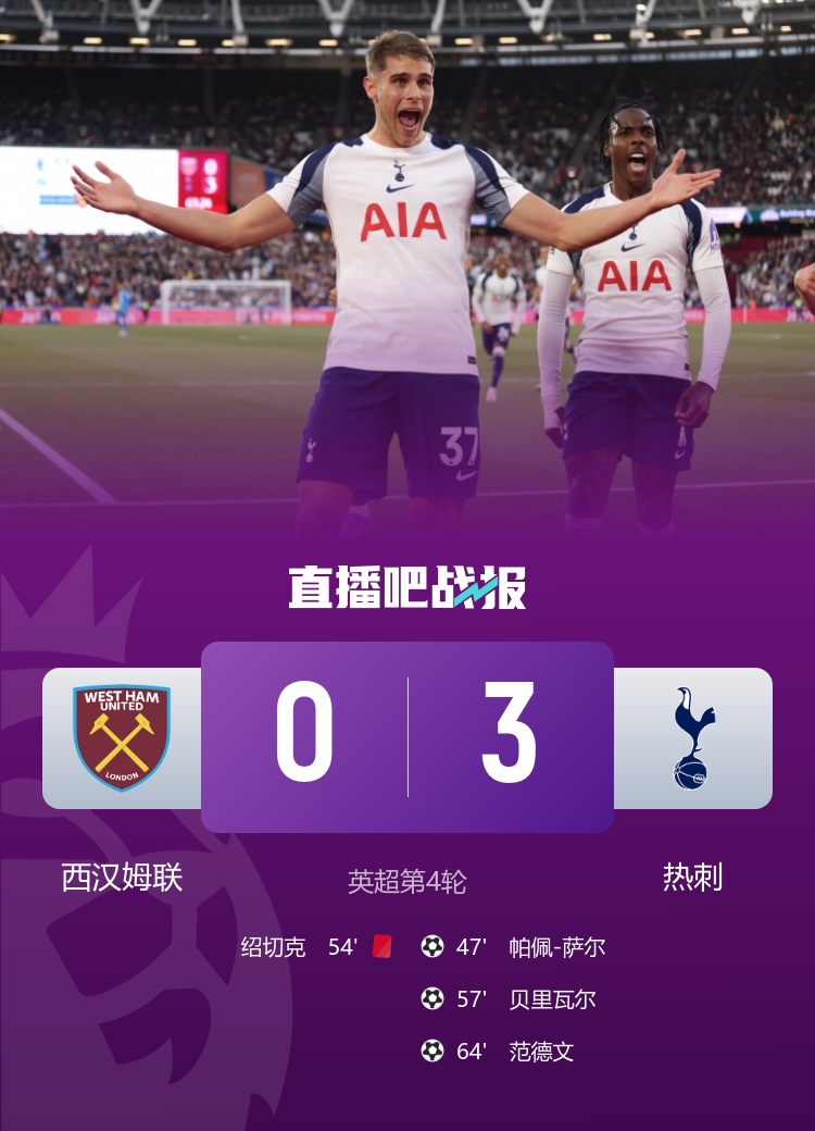 9月14日讯 数据流露,热刺队史初度在英超客场赢西汉姆联3球及以上。