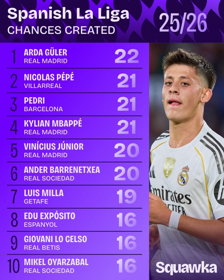 10月7日讯 日前,Squawka统计了本赛季西甲创造契机次数名次,居勒尔22次居首。