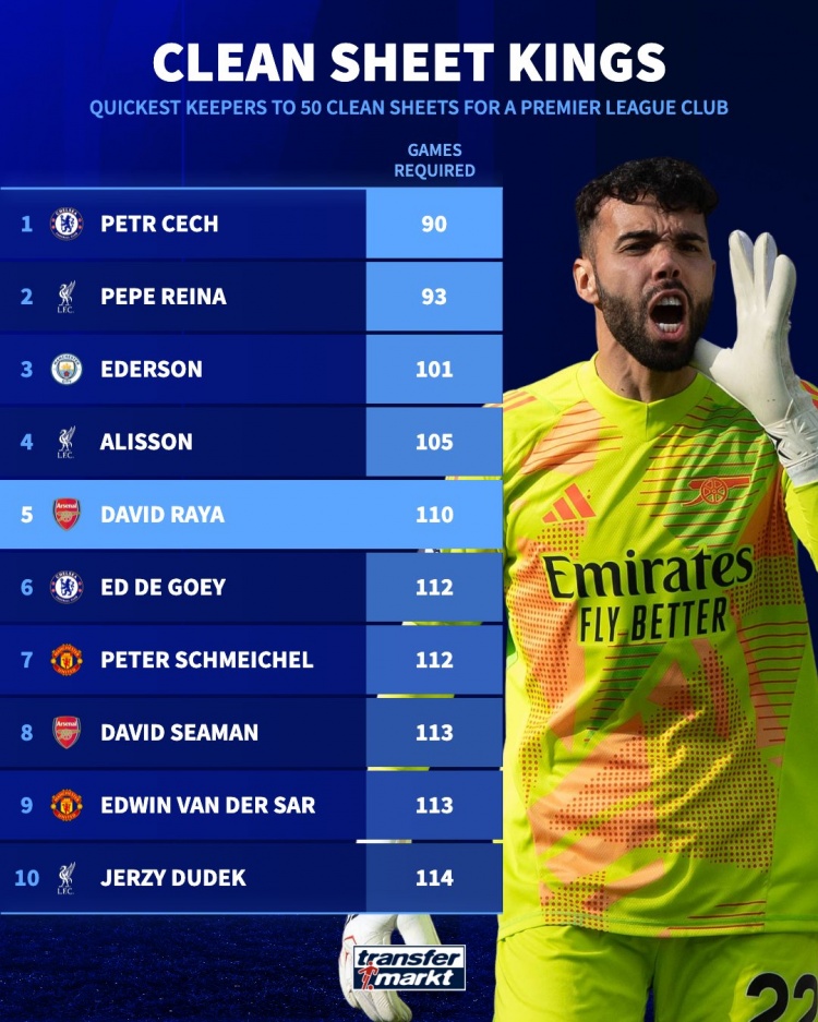 11月6日讯 阿森纳在欧冠客场3-0打败布拉格斯拉维亚,拉亚完成了阿森纳生计的第50场零封,策画用了110场比赛,排名英超俱乐部门将50场零封第五快。