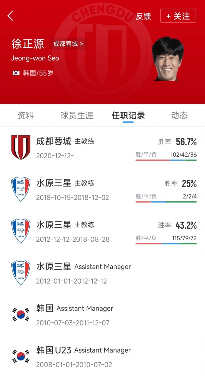 徐正源现年55岁,2020年底运转担任成皆蓉城主帅。本赛季中超29轮事后,成皆蓉城战绩为17胜8平4负,排在第三。