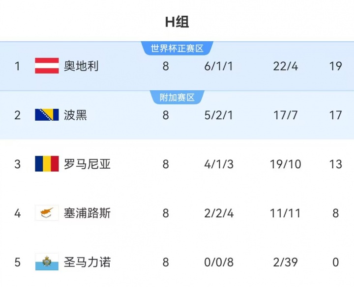 H组:奥地利头名纵贯正赛,波黑第2将参加附加赛,罗马尼亚凭借欧国联收成参预附加赛