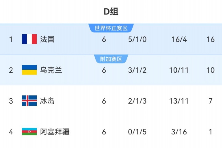 D组:法国头名纵贯正赛,乌克兰第2将参加附加赛