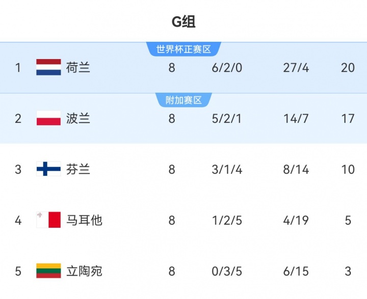 G组:荷兰头名纵贯正赛,波兰第2将参加附加赛