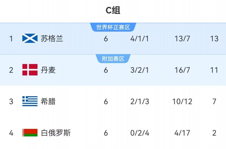 C组:苏格兰头名纵贯正赛,丹麦第2将参加附加赛