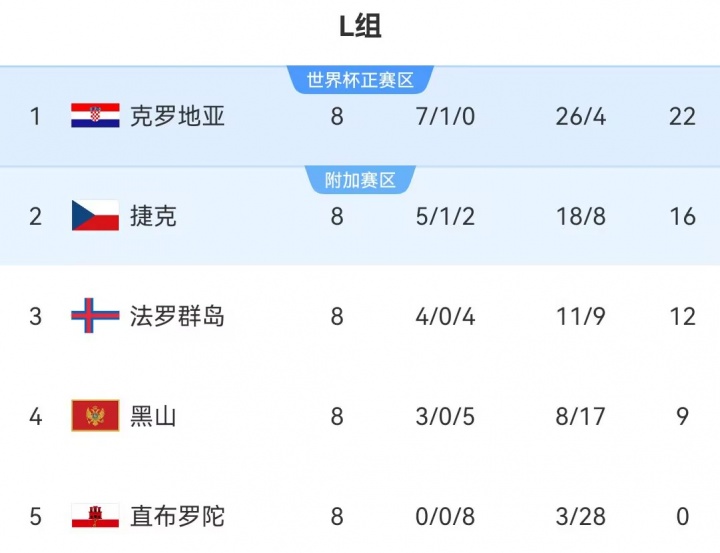 L组:克罗地亚头名纵贯正赛,捷克第2将参加附加赛