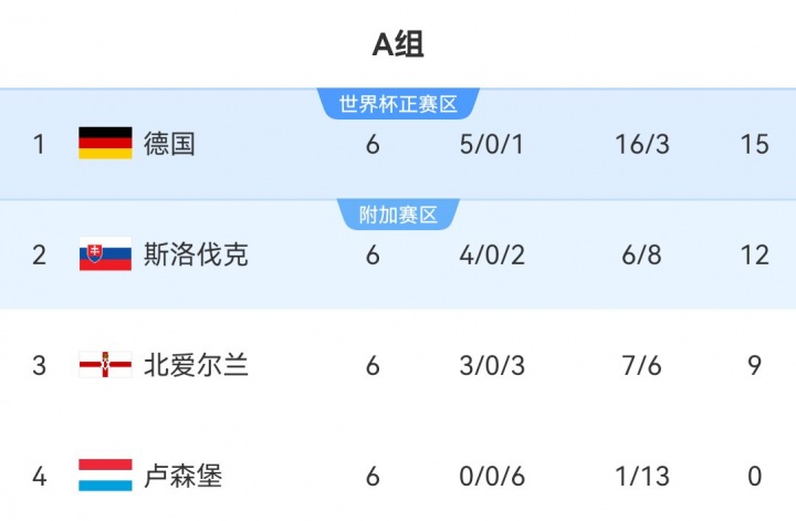 A组:德国头名纵贯正赛,斯洛伐克第2将参加附加赛,北爱尔兰凭借欧国联收成参预附加赛