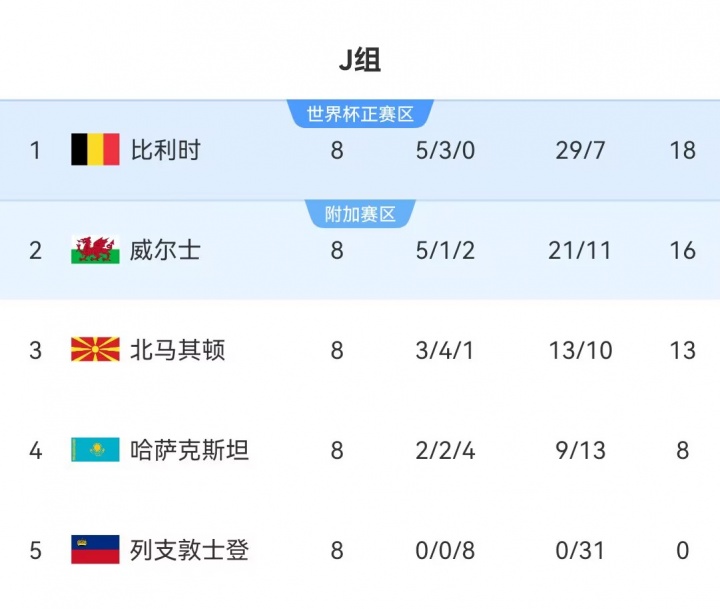 J组:比利时头名纵贯正赛,威尔士第2将参加附加赛,北马其顿凭借欧国联收成参预附加赛