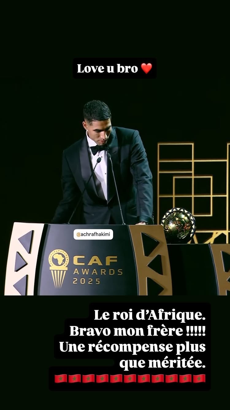 他的好友姆巴佩也通过社媒晒出阿什拉夫的获奖照,并配文:“爱你,昆玉!非洲之王。干得漂亮,我的昆玉...这份荣誉实至名归。”