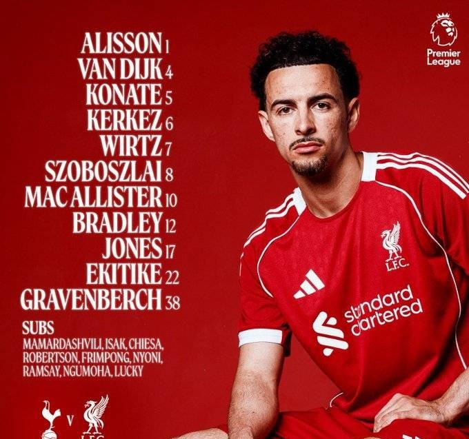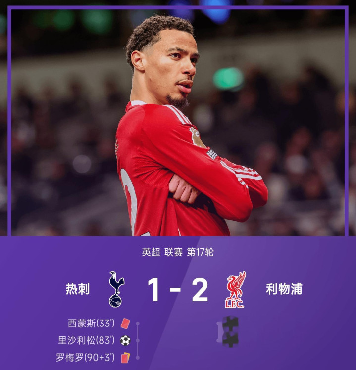12月21日 25/26赛季英超联赛第17轮,利物浦2-1征服热刺。上半场第33分钟,西蒙斯因踩踏范戴克被直红罚下。易边再战,伊萨克以及埃基蒂克先后破门,匡助利物浦赢得两球最初。尽管里沙利松于第83分钟打入一球,匡助热刺扳回一城。但第93分钟,罗梅罗领到第二张黄牌被罚下,最终9东说念主作战的热刺无力追逐,主场1-2不敌利物浦。