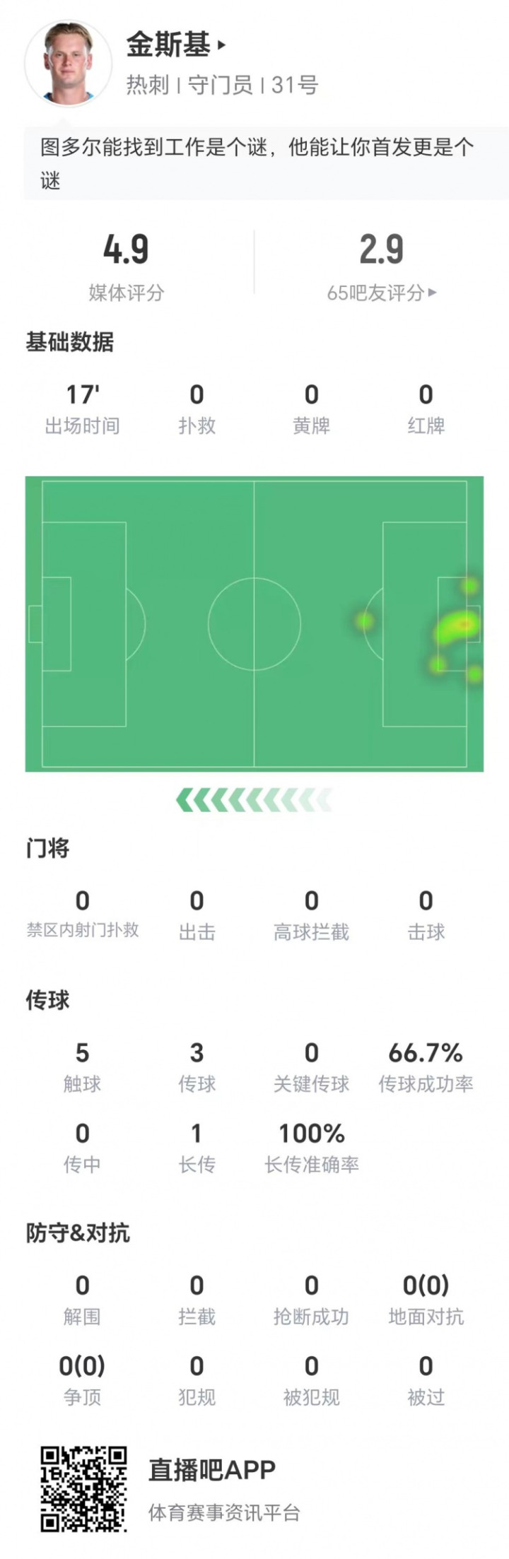 足球比赛数据数据显示,金斯基球队本土球场对决零救球,多项数据挂零,仅有5次触球,获评4.9分。