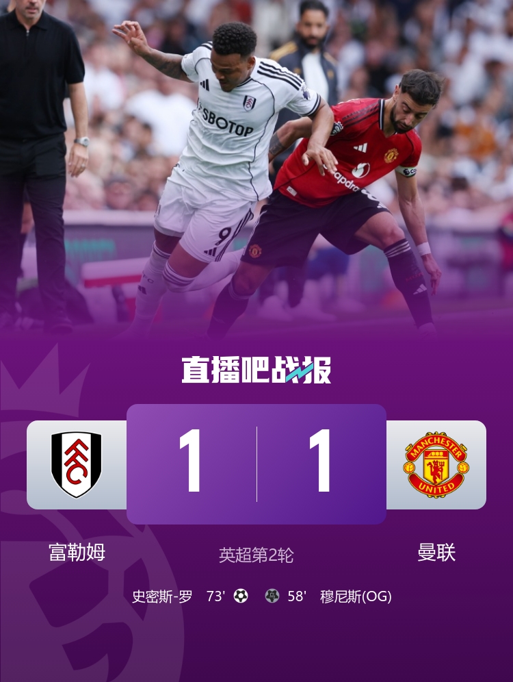 约罗头球酿成穆尼斯乌龙,替补登场的史姑娘-罗扳平比分,最终曼联1-1富勒姆,开赛两轮不堪。
