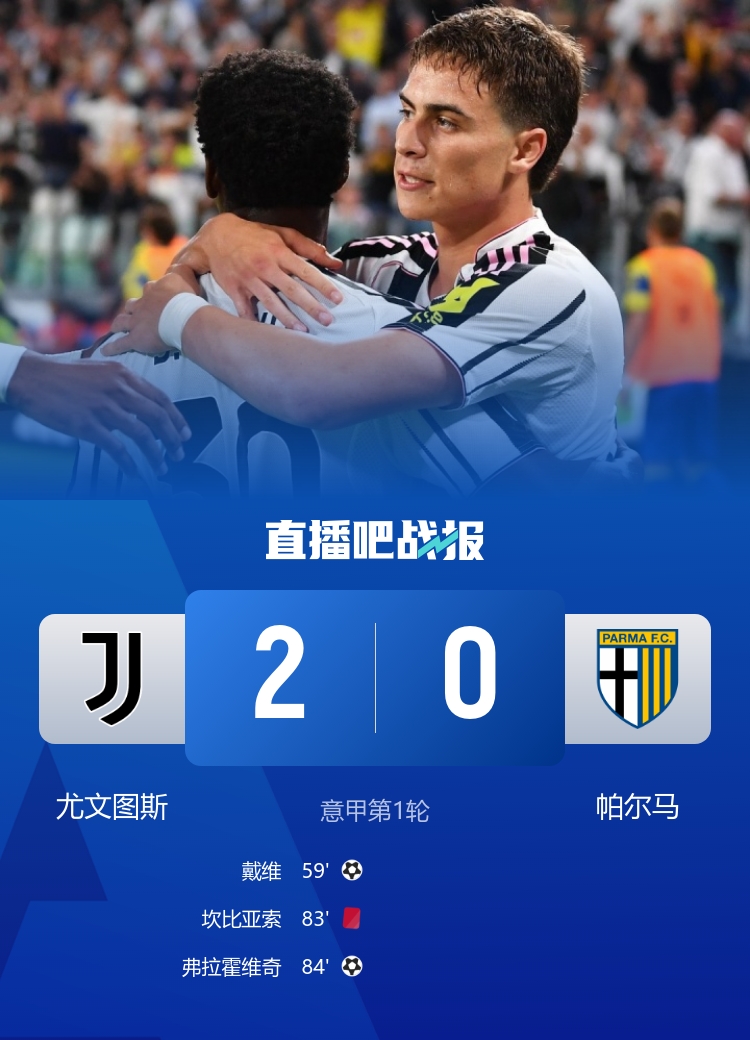 戴维得益尤文正赛首球,弗拉霍维奇替补破门,坎比亚索膺惩四肢染红。最终十东说念主尤文主场2-0驯服帕尔马。