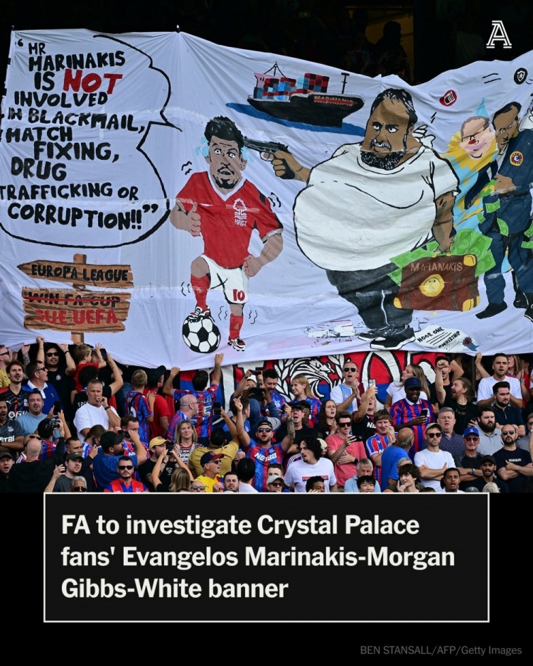 据TA报谈,英足总将造访水晶宫球迷展示的一面横幅,横幅上知道诺丁汉丛林雇主马里纳基斯抓枪对着中场球员吉布斯-怀特的头部。