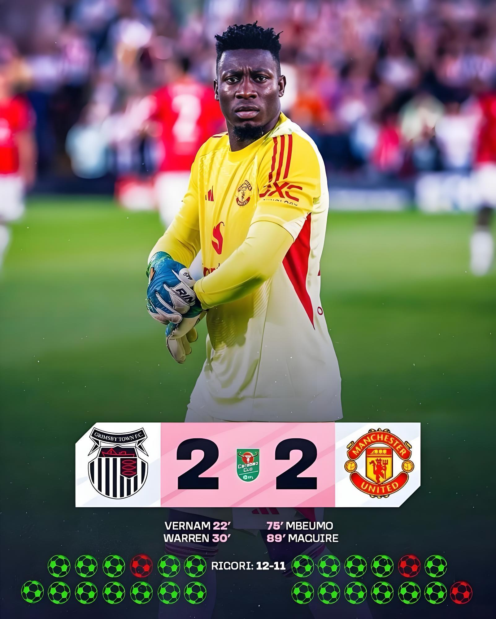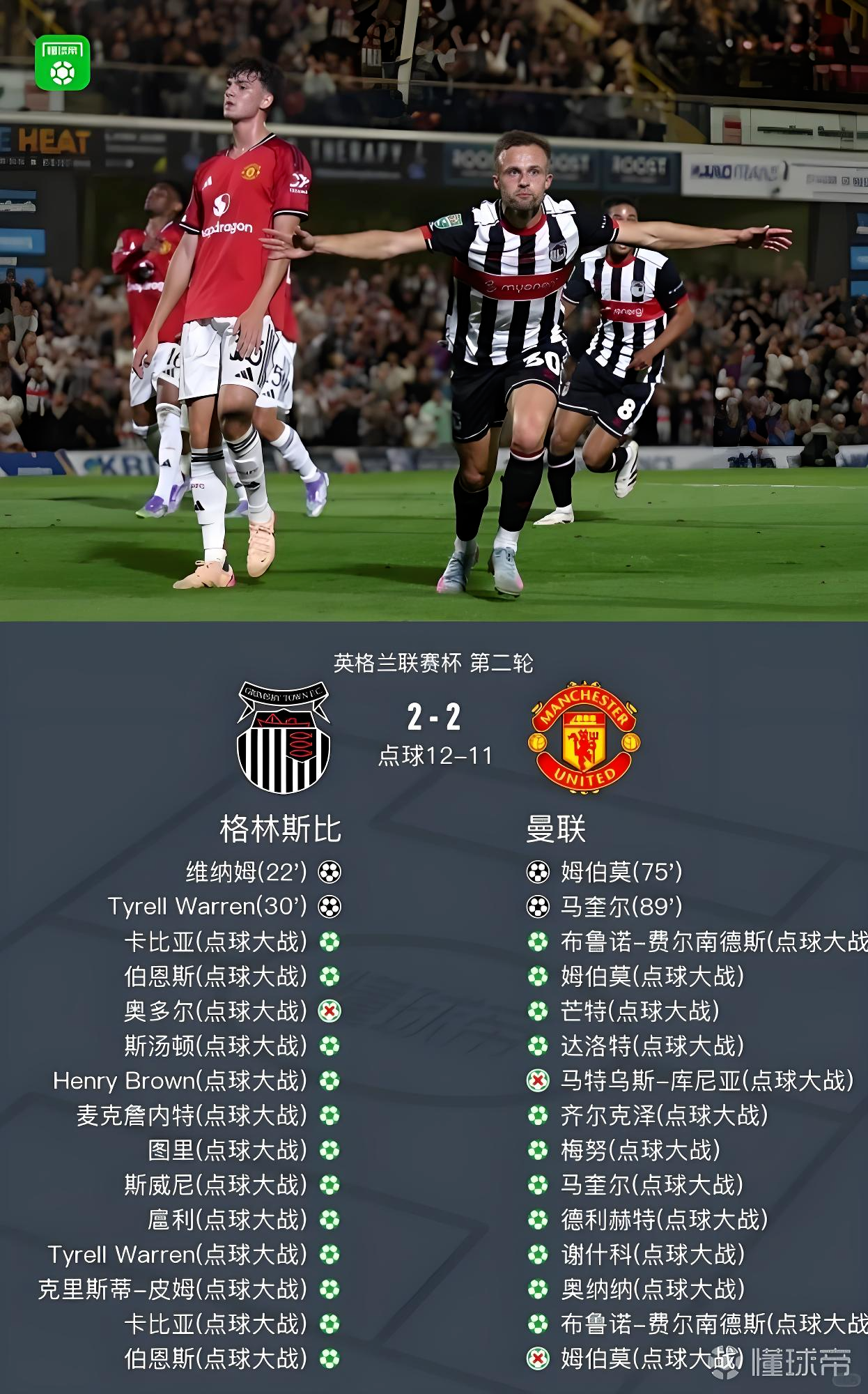 最终,曼联点球11-12不敌格林斯比,惨遭出局。