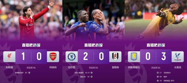 09月01日讯 英超第3轮比赛,切尔西2-0富勒姆、利物浦1-0阿森纳、水晶宫3-0维拉。