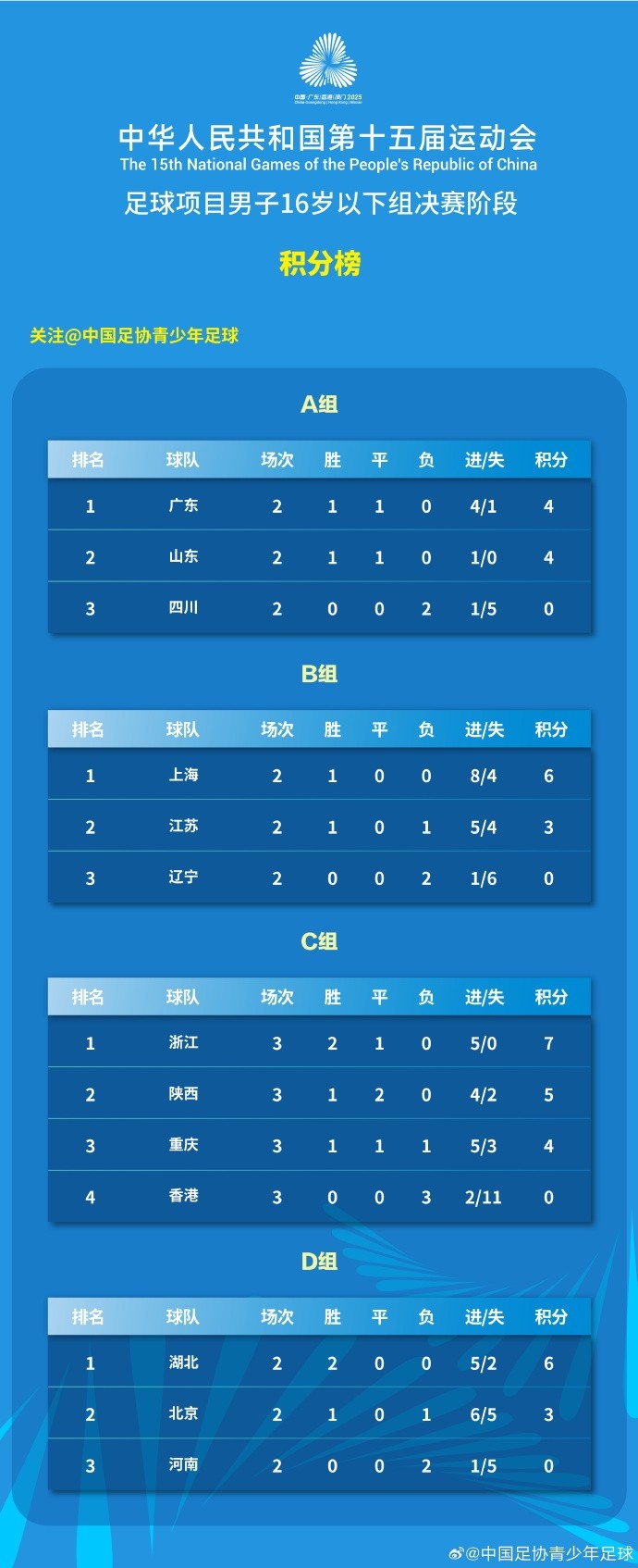 #全运会# 中华东谈主民共和国第十五届通顺会足球款式男人16岁以下组决赛阶段第三比赛日赛果和积分榜 🎙️