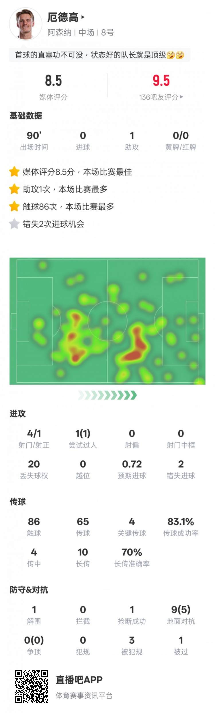 10月2日讯 欧冠联赛阶段第2轮,阿森纳2-0奥林匹亚科斯。本场比赛,厄德高首发出战,送出1次助攻,4次枢纽传球,但也有2次错失进球契机,评分8.5全场最高。