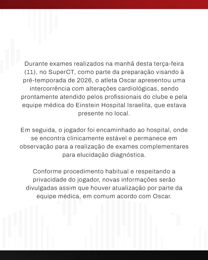 行动备战 2026 年季前赛的一部分,在本周二(11日)上昼于 SuperCT 进行的查验中,通顺员奥斯卡出现腹黑相配情况,马上由俱乐部专科东谈主员及现场的以色列埃因斯坦病院医疗团队首要救治。随后,球员被转送至病院,现在临床情况厚实,并留院不雅察以进行进一步查验明确会诊。按照通例并尊重球员秘籍,后续信息将在医疗团队与奥斯卡共同应许后实时更新。