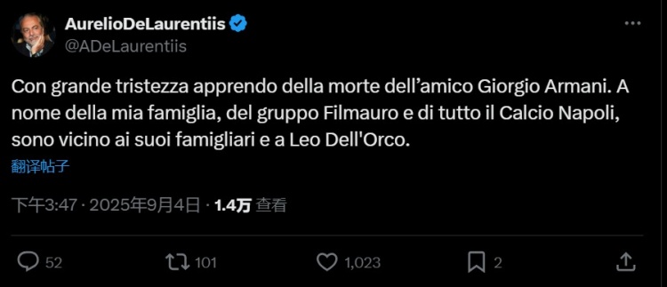 德劳伦蒂斯写谈:“我怀着万分哀吊的式样得知我的一又友乔治-阿玛尼弃世。谨代表我的家东谈主、Filmauro集团以及统统这个词那不勒斯俱乐部,向他的家东谈主和莱奥-德尔奥尔科(阿玛尼的副手)默示真切慰问。”